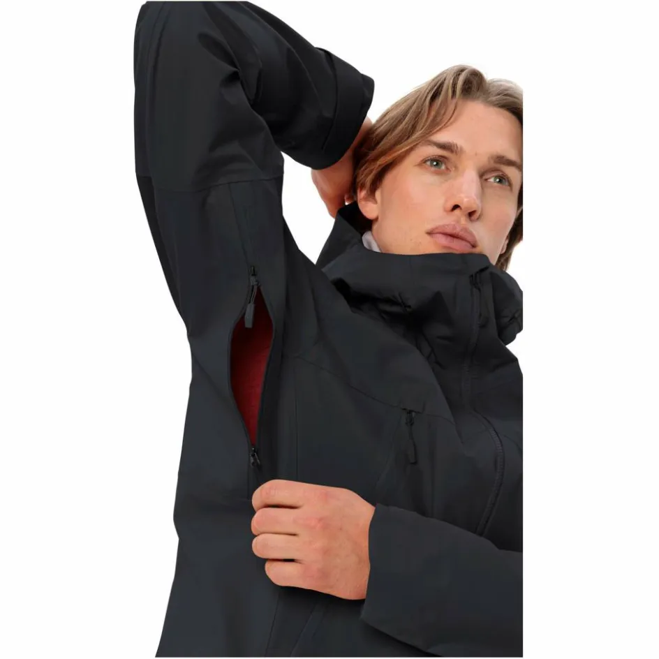 Auch der Schnitt ist an die Bedürfnisse von Alpinisten angepasst: Die zweifach regulierbare Kapuze ist helmkompatibel. Dank der ergonomisch vorgeformten Ärmel rutscht die Jacke selbst bei hohen Griffen über Kopf nicht aus dem Gurt. Die beiden großen Fronttaschen sind auch mit Klettergurt und Rucksack gut zu erreichen und bieten Platz für Handschuhe, Karte und andere Ausrüstung. Ihr geringes Gewicht und Packmaß machen die Hardshell zu einer technischen Alpinjacke, die in jeden Rucksack passt und auf die zu jeder Zeit Verlass ist.