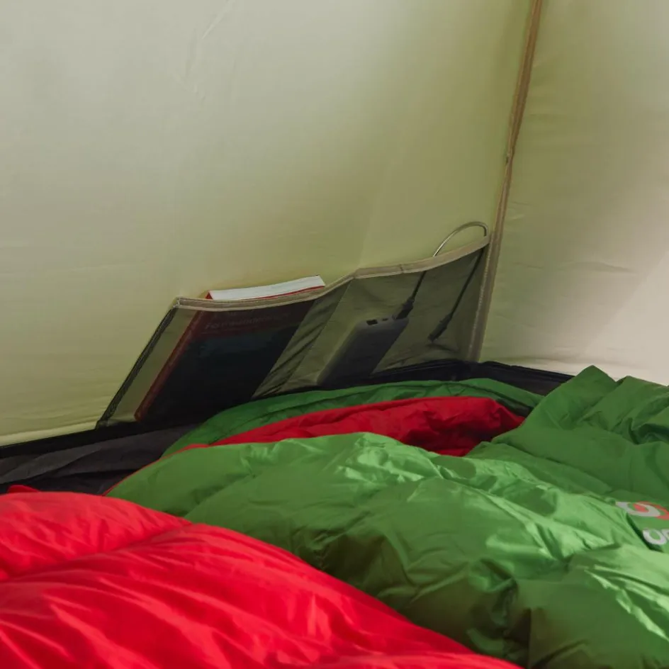 Das Innenzelt ist für zwei Personen großzügig geschnitten. Mit einer Höhe von 105 cm kannst du bequem sitzen und auch das Anziehen am Morgen ist ohne große Verrenkungen möglich. In den vier Seitentaschen lassen sich Bücher, Stirnlampe, Mobiltelefon u. Ä. griffbereit aufbewahren. Der Innenzelteingang ist mit einem Moskitonetz ausgestattet und kann bei Bedarf mit Stoff verschlossen werden. Damit du nicht jedes Mal den Eingang aufrollen musst, befinden sich zwei zusätzliche Netztaschen neben der Tür, in der sich die Türen unkompliziert verstauen lassen.
