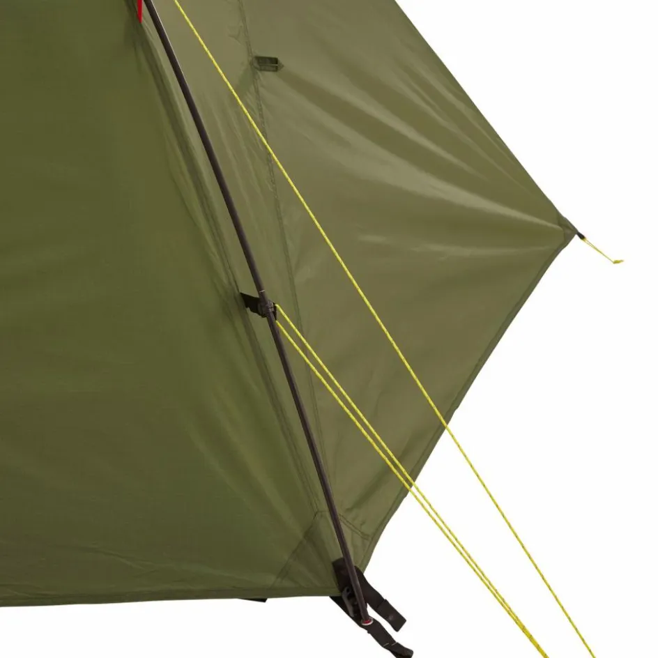 Das Kuppelzelt ist dank der einfachen Konstruktion schnell aufgebaut und steht mit nur zwei Heringen. Da das Innenzelt mit dem Außenzelt gleichzeitig aufgebaut werden kann, ist auch ein Aufbau im Regen möglich, ohne dass das Innenzelt nass wird. Die Konstruktion wie auch das Aluminiumgestänge sind robust und halten auch kräftigem Wind stand.