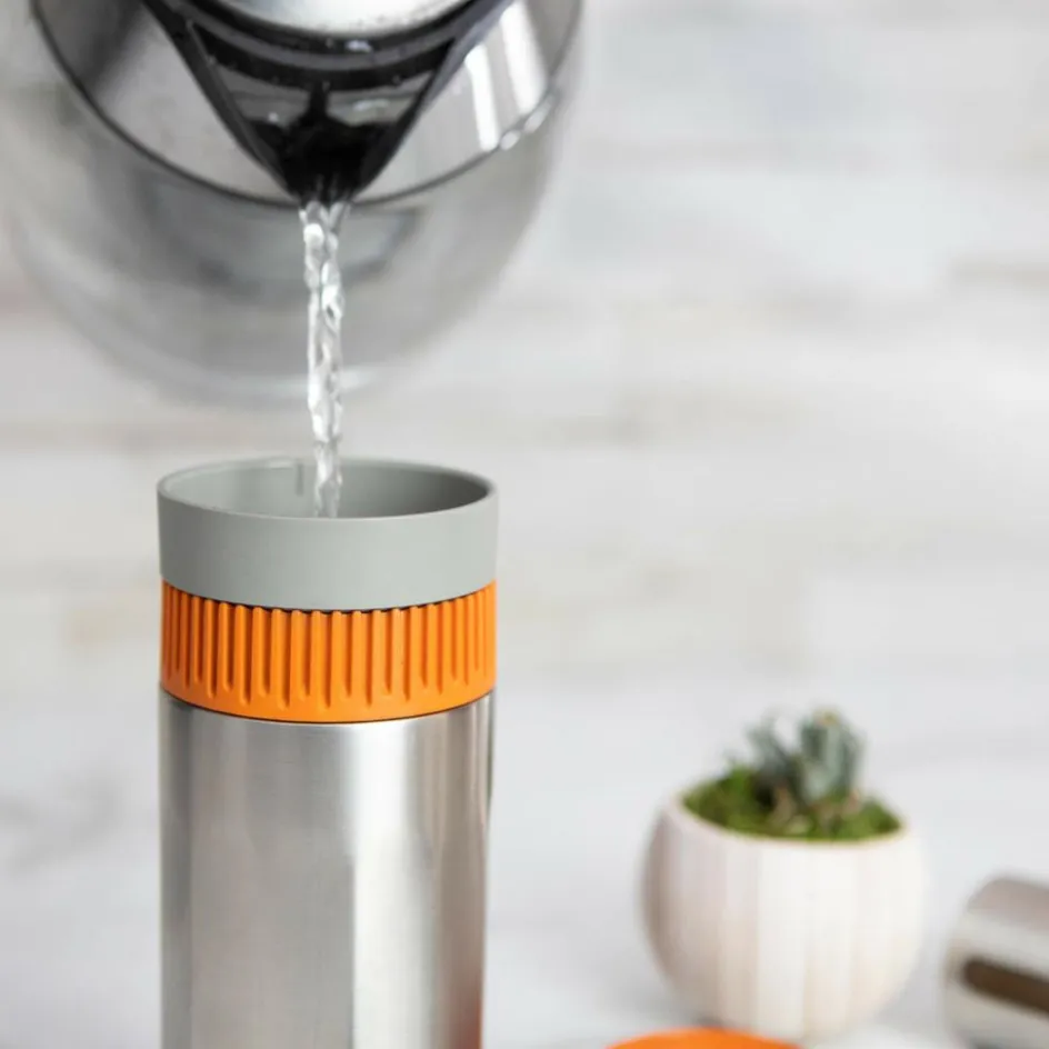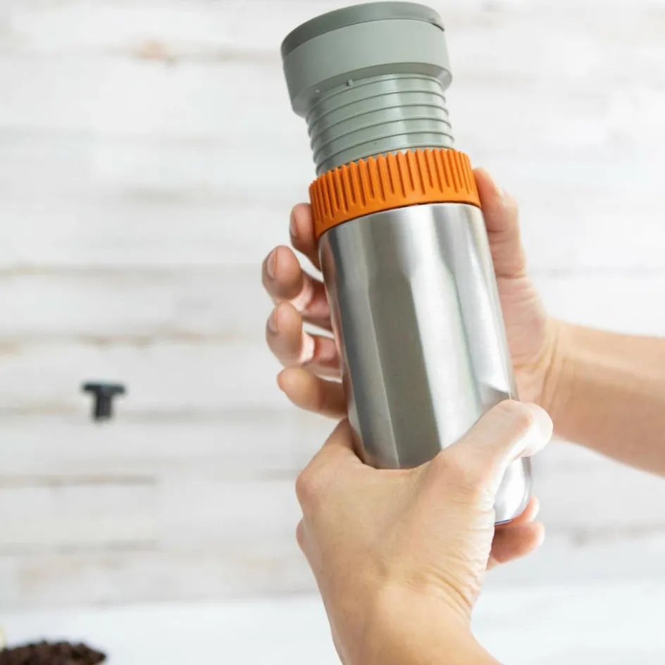Dann steckst du das Wasserreservoir in den Edelstahl-Thermobecher und füllst es bis zur Markierung mit heißem Wasser. Anschließend legst du den Kaffeefiltereinsatz von oben ins Wasserreservoir, wo er auf den Becherboden absinkt. Nun setzt du den Deckel auf und drehst am orangenen Ring, bis sich das Reservoir vollständig aus dem Becher geschraubt hat.