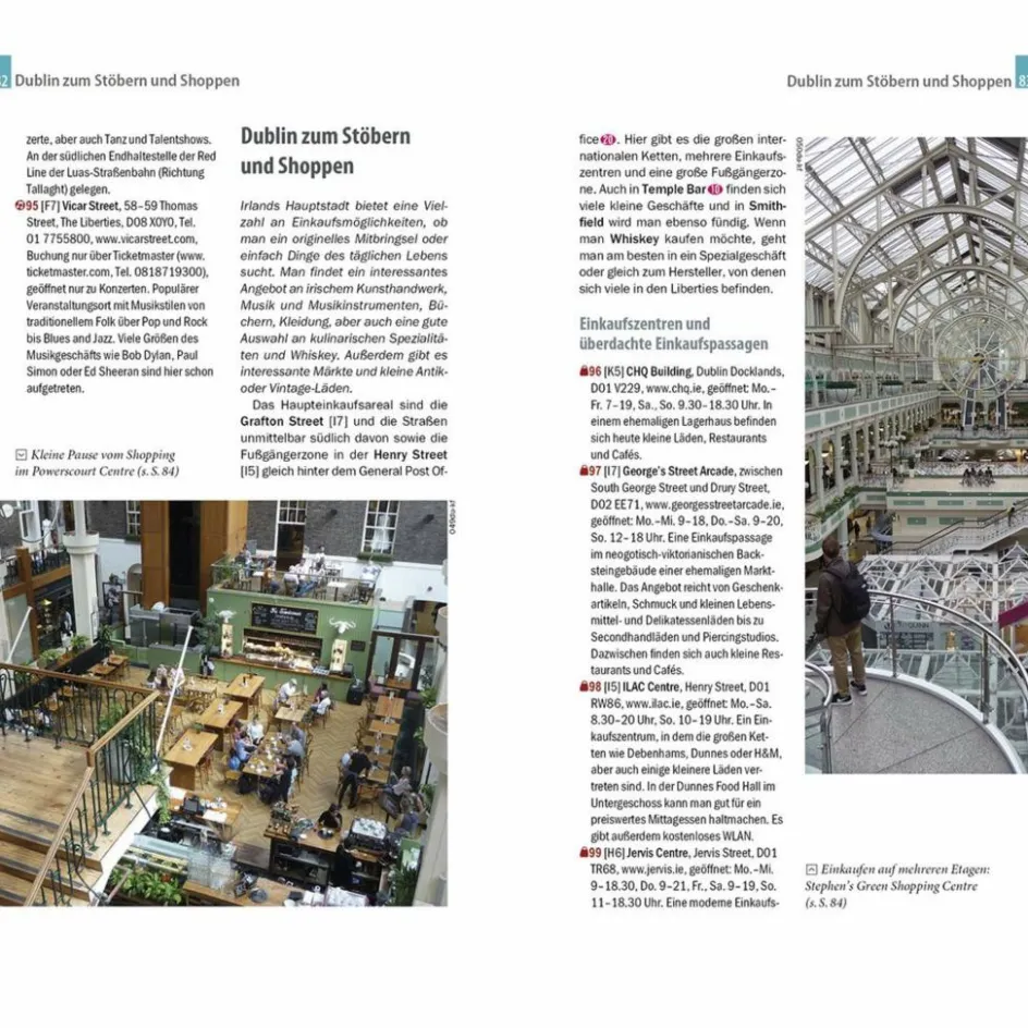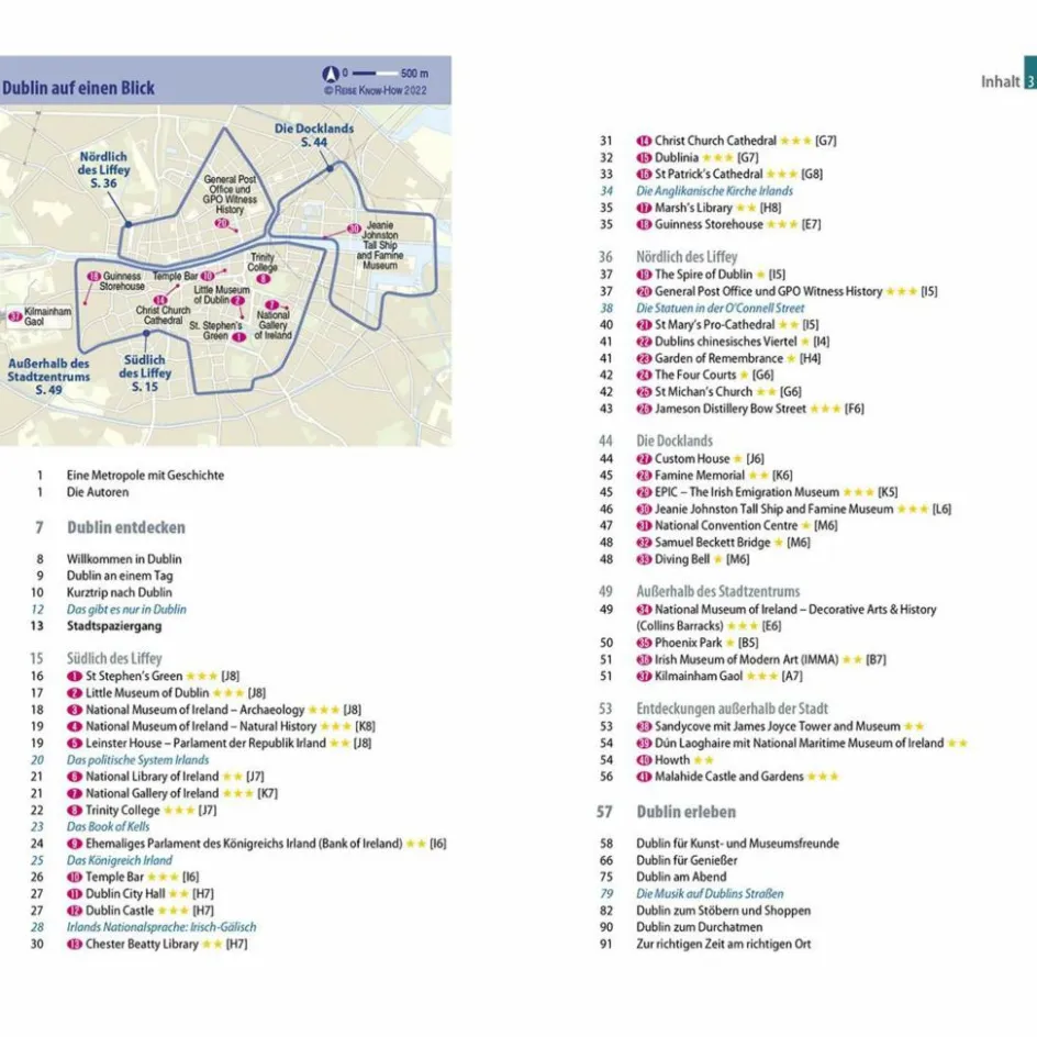 Tipps für die Abend- und Nachtgestaltung: von den „sessions“ im Pub bis zum Theaterbesuch – Vom Guinness bis zum Tee: irische Nationalgetränke – Dublin zum Träumen und Entspannen: St. Stephen’s Green, Phoenix Park und der Campus des Trinity College – Ausgewählte Unterkünfte von preiswert bis ausgefallen – Alle praktischen Infos zu Anreise, Preisen, Stadtverkehr, Touren, Events, Hilfe im Notfall … – Hintergrundartikel mit Tiefgang: Geschichte, Mentalität der Bewohner, Leben in der Stadt …