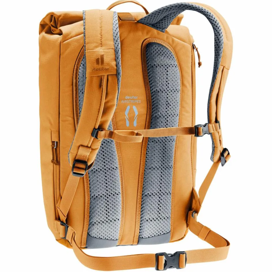 Ein seitlicher RV ermöglicht dir einen schnellen Zugriff auf deinen Laptop. Das geräumige Hauptfach hat einen Rollverschluss, mit dem du das Volumen des Rucksacks regulieren kannst. Zu den Innenfächern gehört auch eine praktische Flaschenhalterung, damit deine Thermokanne immer aufrecht steht. Seitlich am Rücken findest du ein RV-Fach zum griffbereiten Verstauen deines Smartphones.