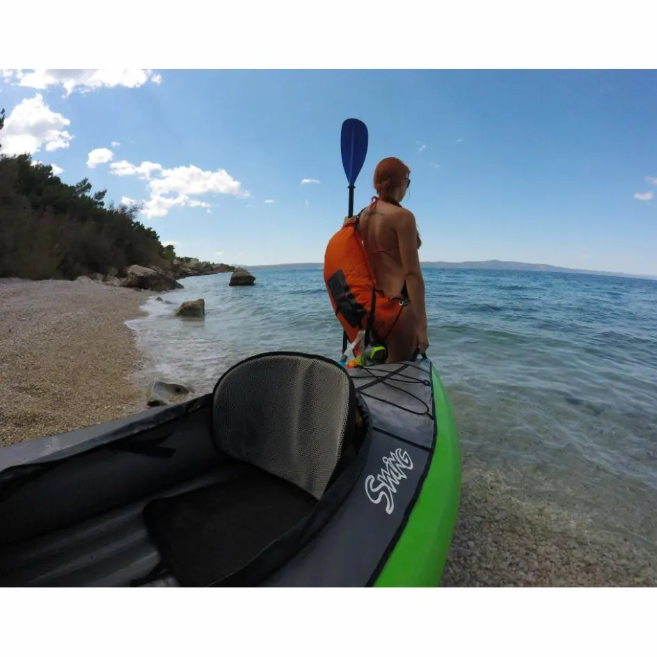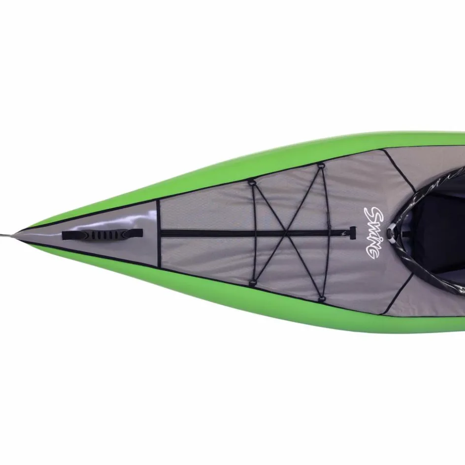 Durch sein geschlossenes Verdeck, eignet sich das Schlauchkajak Swing neben Seen und geschützen Buchten auch für leichtes Wildwasser (bis WW2) und schützt dich und dein Gepäck vor Spritzwasser.
