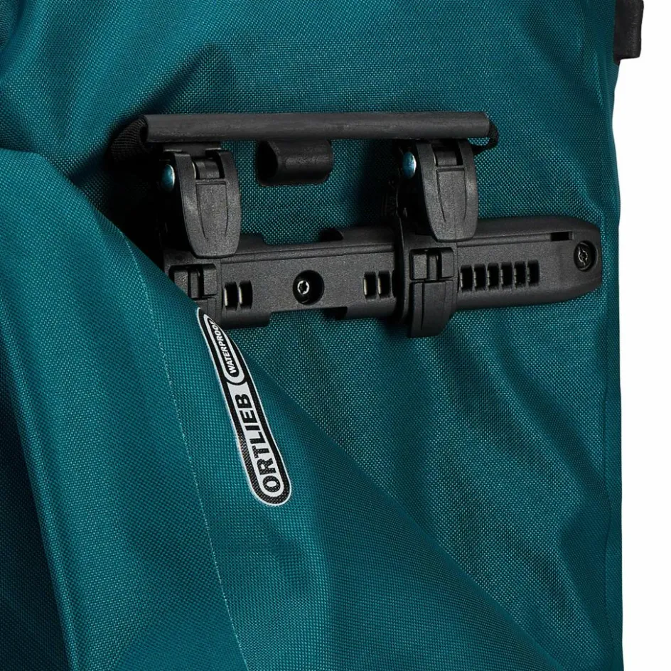 Aufhängung für Gepäckträger mit einem Rohrdurchmesser von 8 bis 16 mm. Die beiden oberen Haken lassen sich werkzeugfrei auf der aus einem Stück gefertigten Schiene verschieben und durch Anheben des Tragegriffs öffnen. Der untere Arretierungshaken ist ebenfalls auf einer halbelliptischen Schiene individuell anpassbar und werkzeugfrei in 15-Grad-Schritten drehbar. Ein Scheuerschutz im unteren Bereich der Taschen und an der Auflagefläche des Gepäckträgers beugt Abrieb vor.