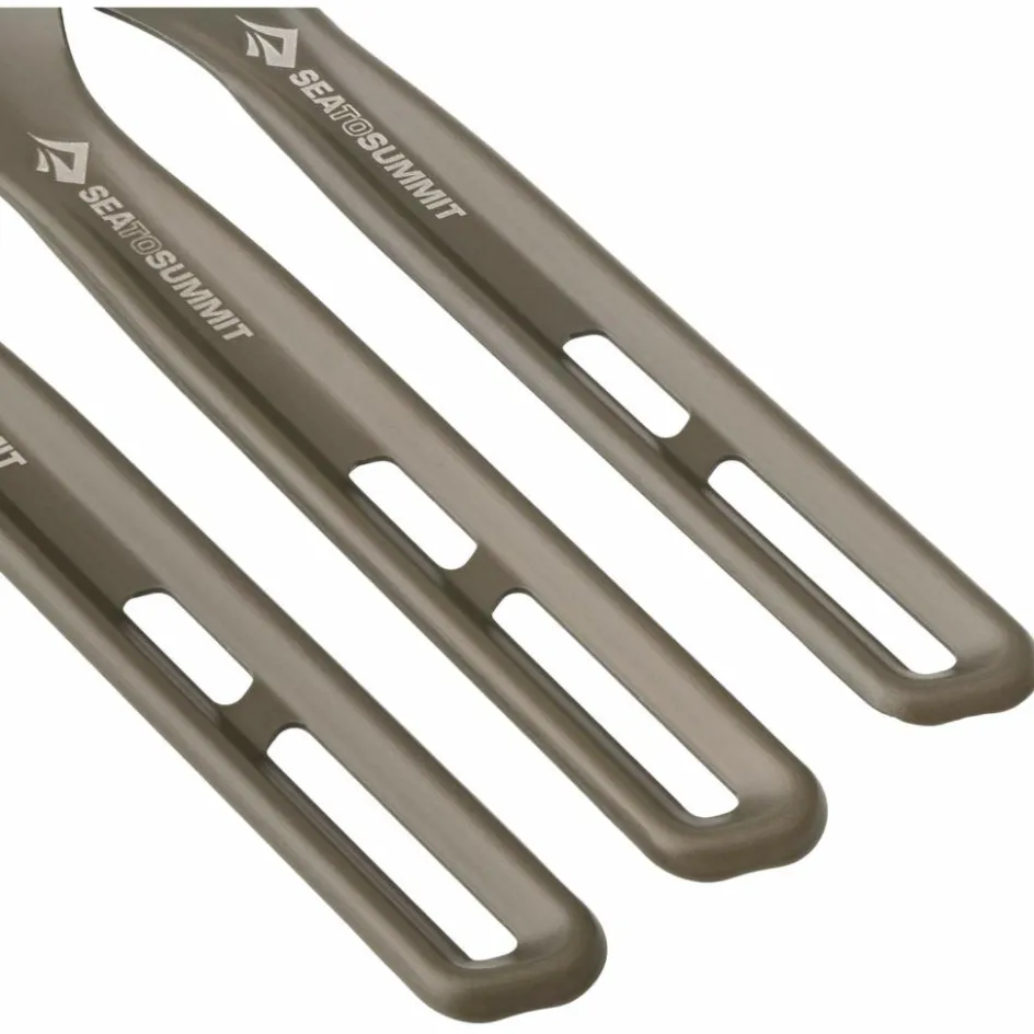 Besteck-Set mit Löffel, Gabel und Messer. Hergestellt aus ultralight Aluminium mit matter, glatter Oberfläche. Langlebiges Design in Exoskelett-Bauweise für extreme Stabilität und Leichtigkeit.