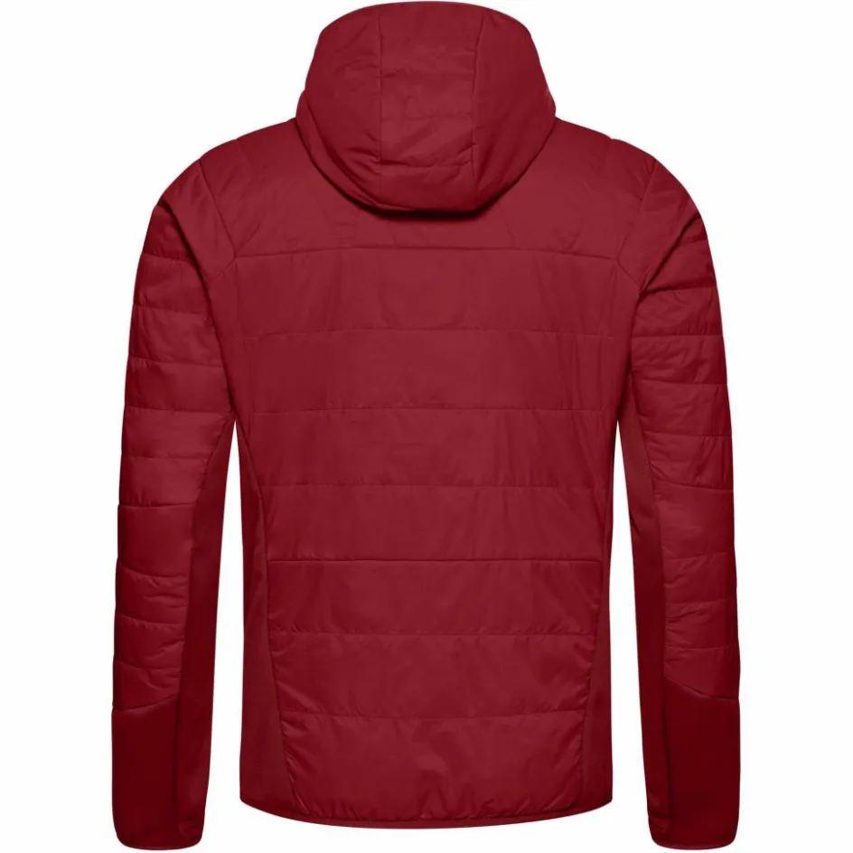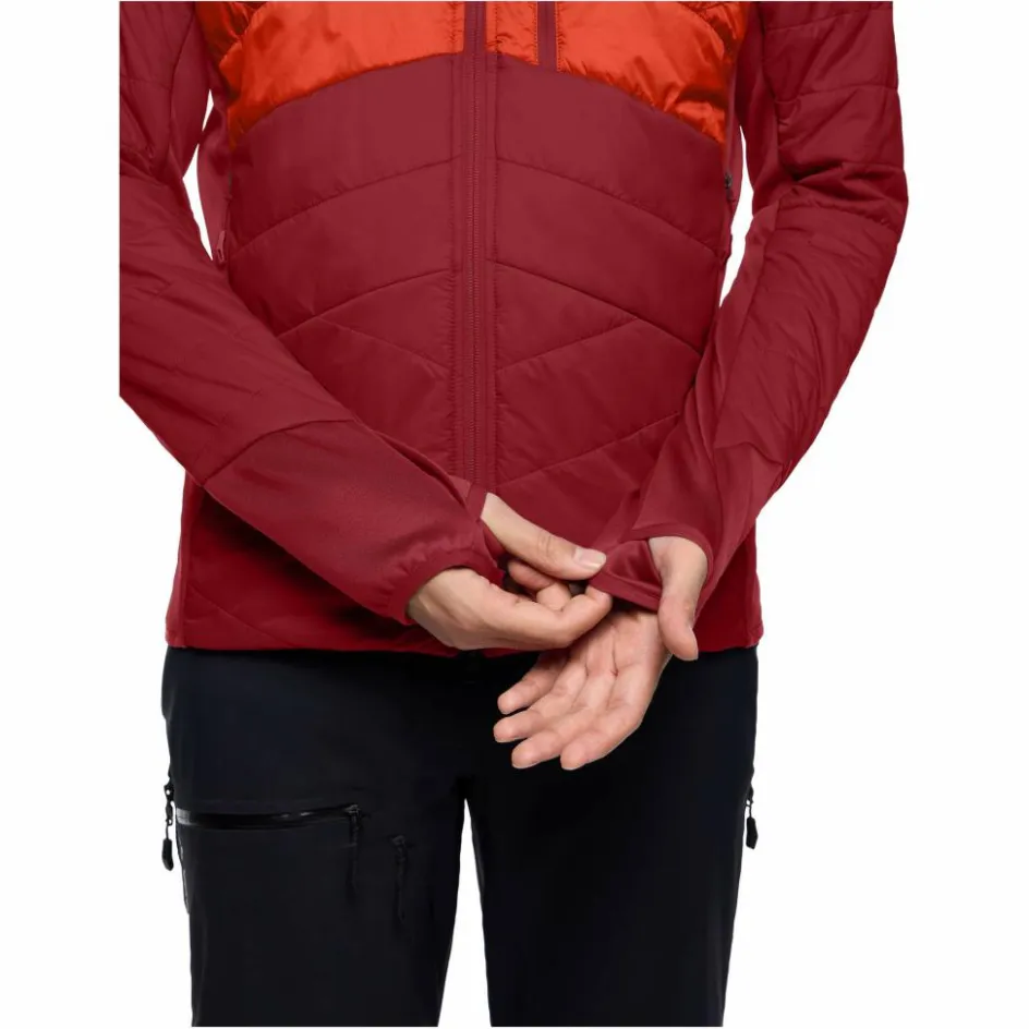Die Isolationsjacke ist an der angeschnittenen Kapuze sowie dem Saum und den Ärmelabschlüssen mit elastischen Einsätzen versehen. Diese sorgen für guten Halt und einen festen Sitz. Die elastischen Ärmelbündchen sind zusätzlich mit Daumenschlaufen ausgestattet. Da verrutscht nichts und das Hineingleiten in eine wetterfeste Außenjacke ist auch viel leichter. Für wichtige Kleinigkeiten oder einfach zum Aufwärmen der Hände stehen die beiden Reißverschlusstaschen bereit. Mit ihrem geringen Packmaß lässt sie sich zudem leicht ihn deinem Gepäck unterbringen.