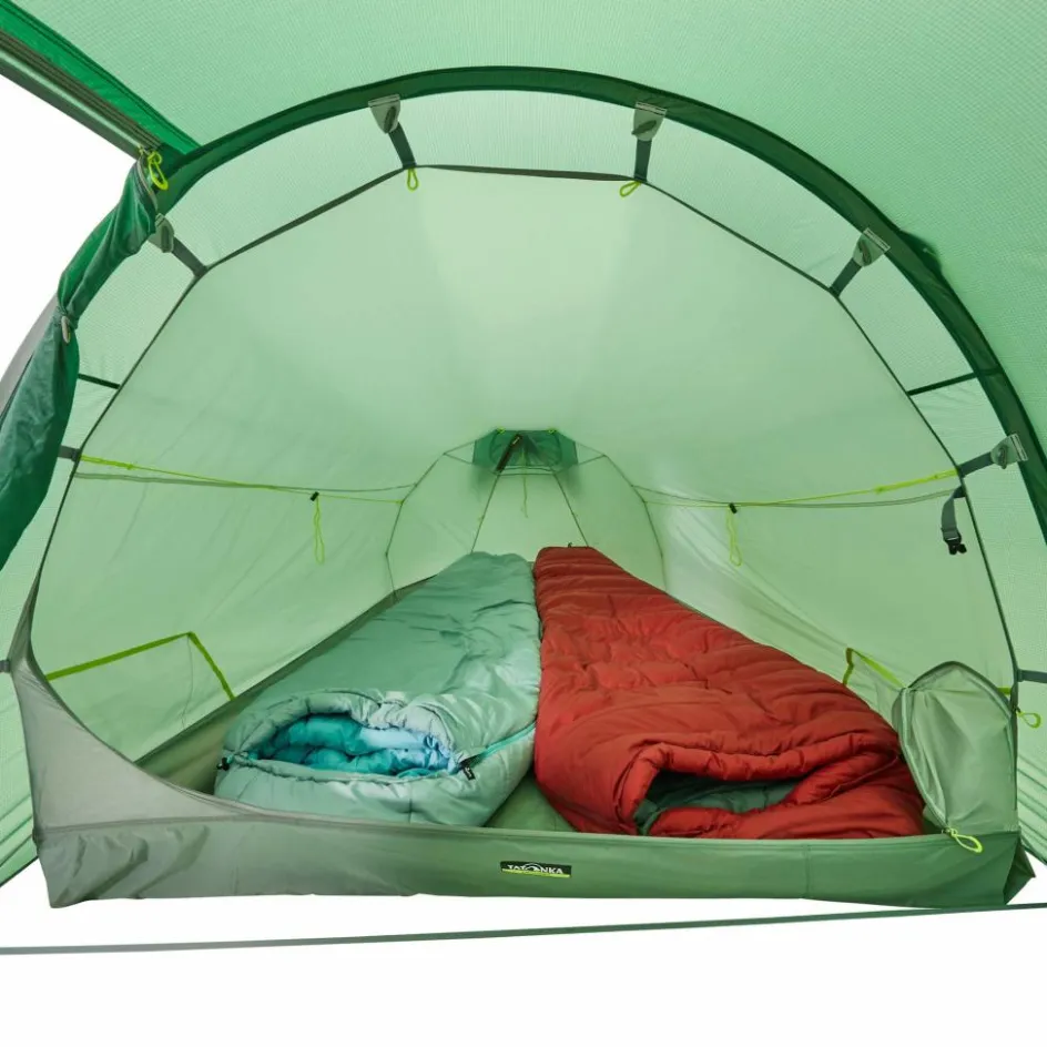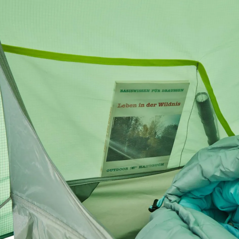 Das Innenzelt ist mit zwei Netztaschen ausgestattet. Dort kannst du Stirnlampen, GPS oder Bücher verstauen. Das Innenzelt ist 95 cm hoch und zum Fußende hin abfallend, wodurch du nicht unnötig viel Luft erwärmen musst. Durch die Höhe kannst du bequem sitzen und dich umziehen.