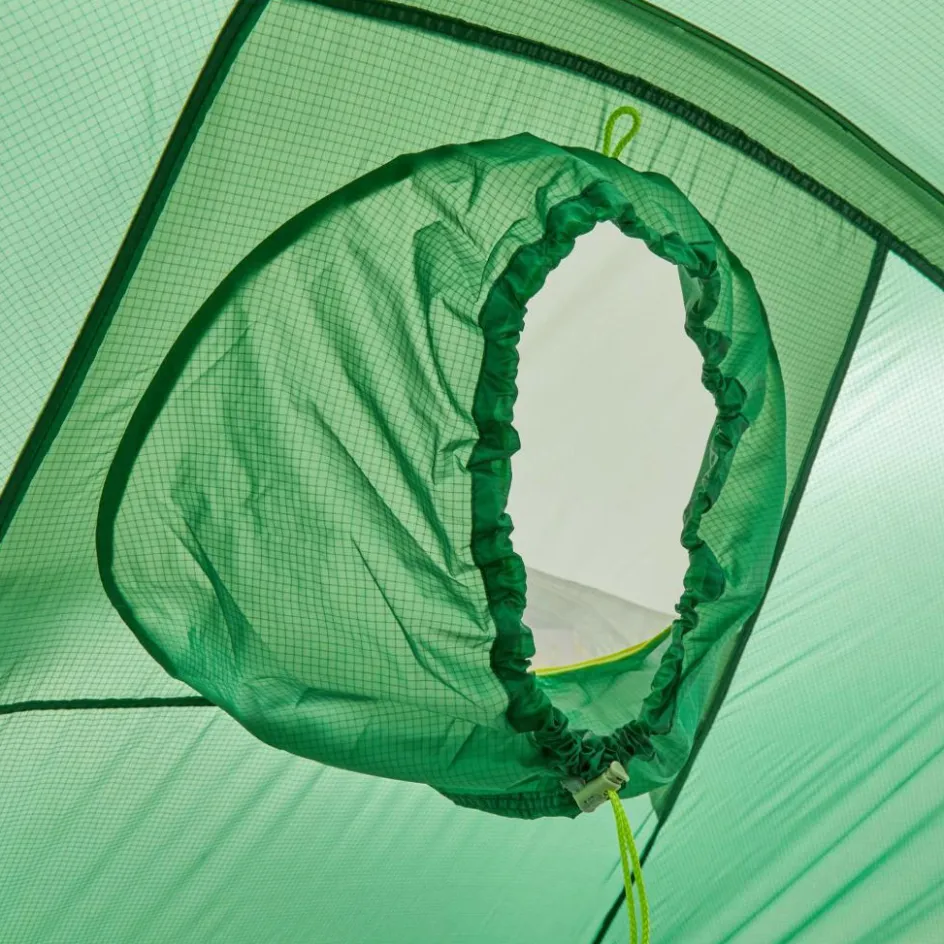 Die abfallende Form des Okisba 2 senkt das Gewicht und die Windangriffsfläche. Durch die zwei verschließbaren Lüfter kannst du das Zelt auch im Winter einsetzen.
