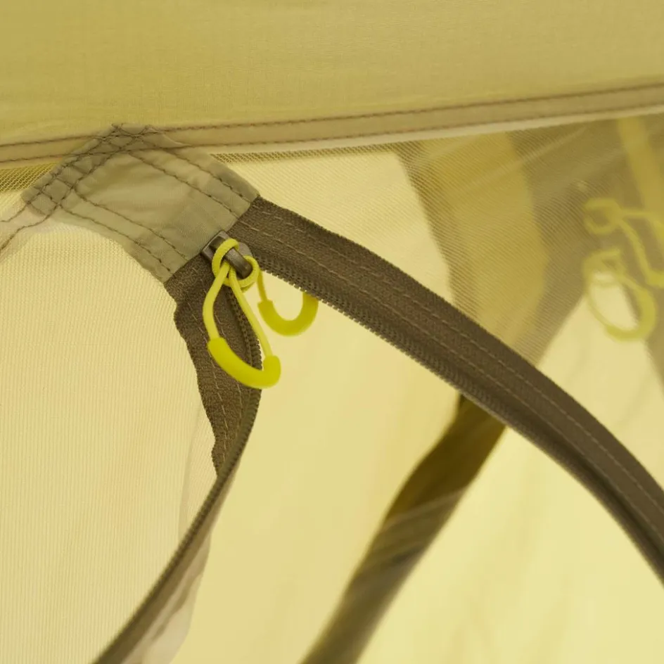 Das Außenzelt wird mit vier unterschiedlich langen Gestängebögen aufgestellt. Da das Innenzelt eingeknüpft bleiben kann, ist das Zelt direkt nach dem Abspannen bezugsfertig. Das vierfach PU-beschichtete Außenzelt weist eine Wassersäule von 8.000 mm auf und ist UV-beständig sowie farbecht. Der Innenzeltboden erreicht sogar eine Wassersäule von 10.000 mm!