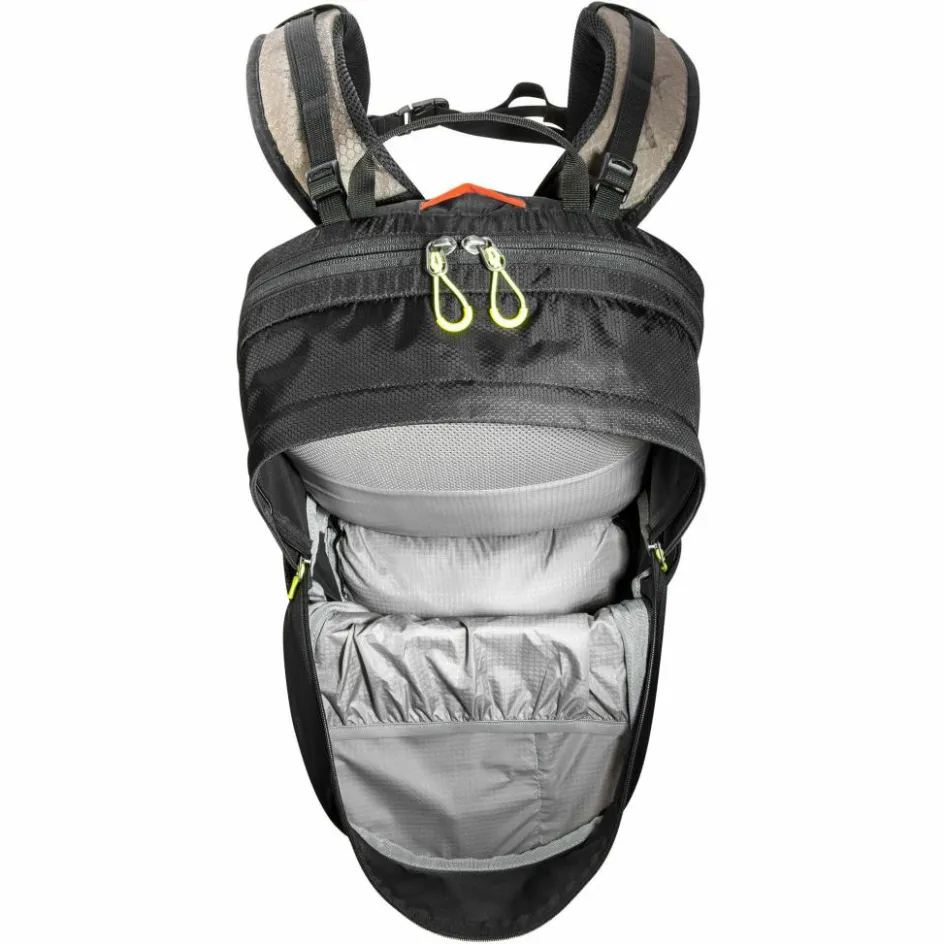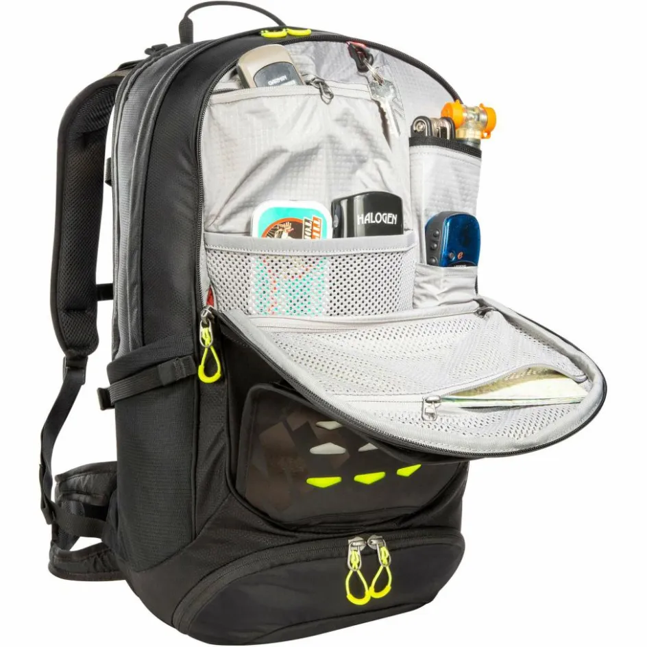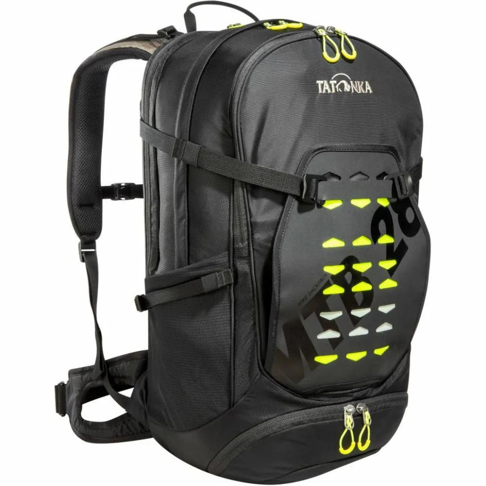 Der Bike Backpack MTB 28 bietet ein Volumen von 28 Litern im Hauptfach, Seitentaschen aus elastischem Material, ein Frontfach mit Einsteckfächern und Schlaufen für Werkzeug und eine Reißverschlusstasche auf einer Hüftflosse. In einem Extra-Fach kann eine Trinkblase verstaut werden. Der Trinkschlauch wird über einen Durchlass nach außen geführt. Im separat zugänglichen Bodenfach ist die Regenhülle verstaut.
