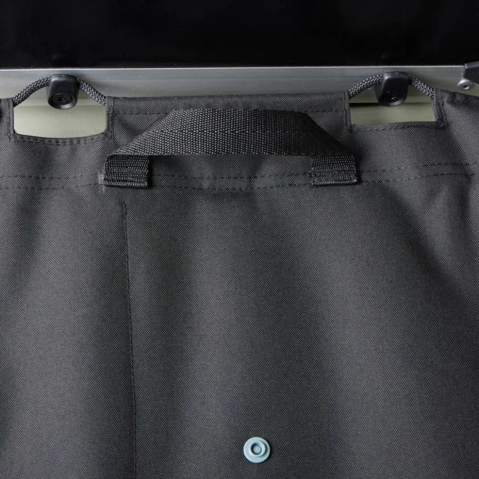 Die Anbringung erfolgt an den Schienen des Dachzeltes entweder durch aufhängen an Ösen oder durch das Einfädeln in eine Schiene. Dank integriertem Tragegriff eignet sich der Organizer auch wunderbar als Duschtasche auf Campingplätzen.