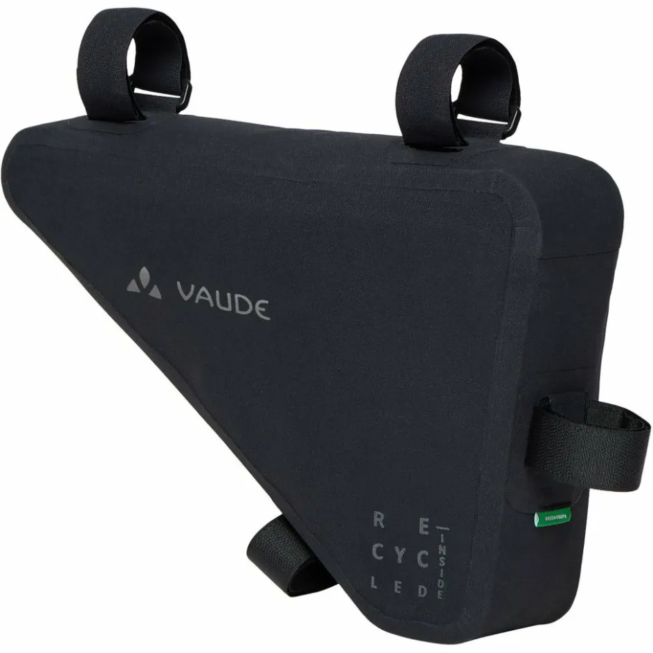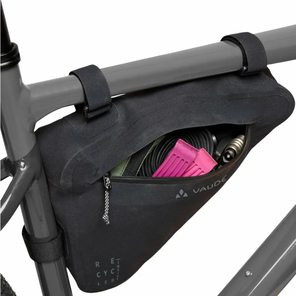 Die Trailframe M ist perfekt fürs Bikepacking geeignet und kann mit der Vaude Trailframe L Tasche kombiniert werden. Die Rahmentasche besteht überwiegend aus recycelten Materialien (64 % Polyamid ist recycelt, 100 % Polyester ist recycelt).