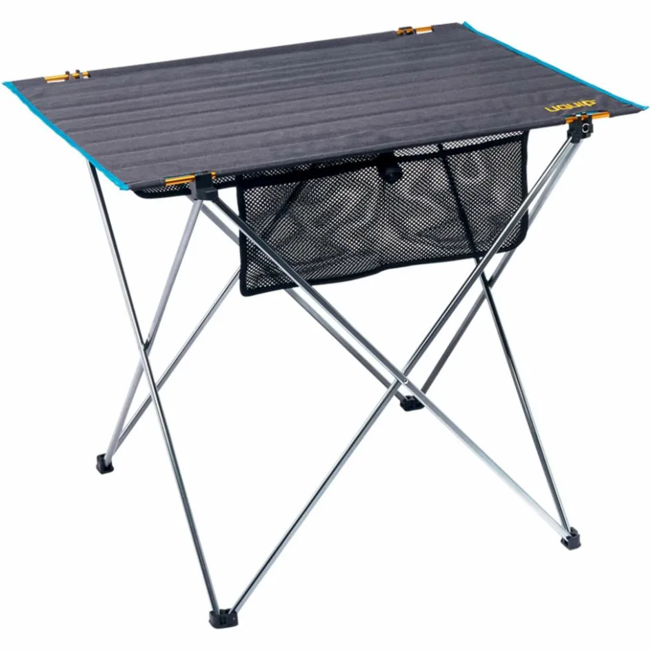 Das pulverbeschichtete Gestänge aus Aluminium kann so gefaltet werden, dass das Packmaß auf 9 cm Durchmesser schrumpft. Aufgefaltet verleiht es dem Tisch die nötige Stabilität. Die Tischplatte wird nach dem Auffalten in die Halterung geklickt, was dem Tisch eine hohe Steifigkeit verleiht.