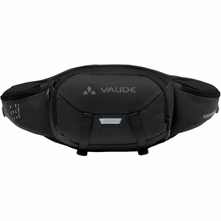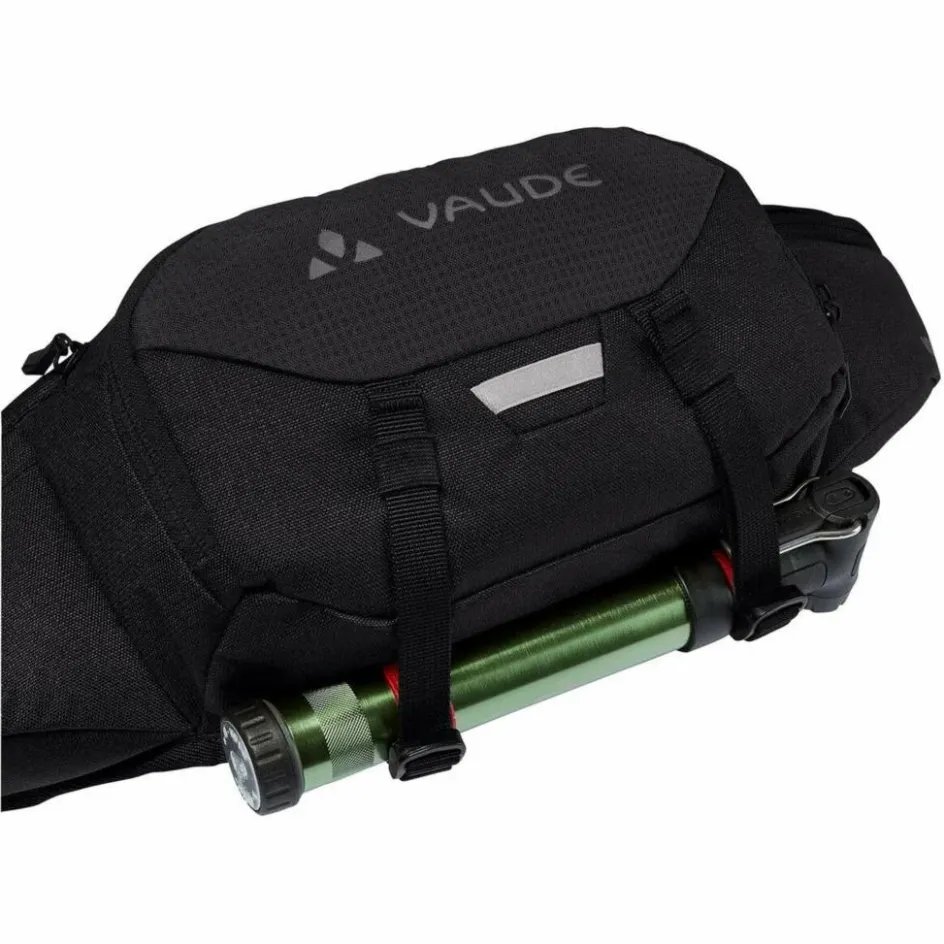 Das hintere Fach bietet über die komplette Breite genügend Platz für Regenjacke und Ersatzschlauch. 2 kleine, mit Reißverschluss verschlossene Seitentaschen schmiegen sich perfekt um den Hüftbereich und verwahren Minitool, Handy oder Riegel. Ein auf die Front aufgesetztes Fach ermöglicht gute Organisation des Werkzeugs. Am Boden der sportlichen Hüfttasche lassen sich sowohl eine Minipumpe als auch vor der Ausfahrt Protektoren befestigen. Eine Regenhülle für Schutz vor Schauern und Schmutz sowie ein reflektierender Webbingloop und das reflektierende Vaude Logo runden dieses Komfortpaket mit 3 l Volumen ab.