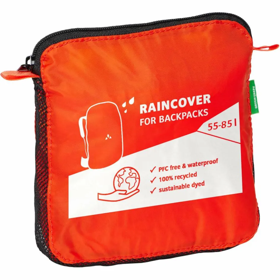 Vaudes Rucksack-Regenhülle für 55- bis 85-l-Modelle zieht plötzlichen Regengüssen den Zahn des Schreckens. Mithilfe des Gummizugs ist die Regenhülle im Handumdrehen an Ort und Stelle. Vaude hat dabei besonderen Wert auf noch mehr Nachhaltigkeit gelegt: Das Material ist nun vollständig recycelt.