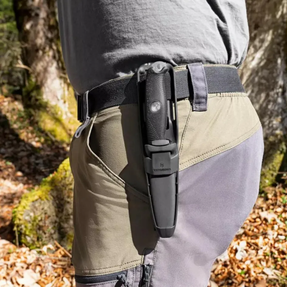 Der Messergriff liegt gut in der Hand, das strukturierte Polymer-Material ist rutschfest – auch bei Feuchtigkeit. Praktisch am Griff ist der Feuerbohrpunkt sowie das Sechskantloch, das als Riemenöse und als Aufnahme des Flachbohrers aus dem Pro Kit dient (siehe dafür unter „Passend dazu“). Auch die Messerscheide lässt sich mehrfach nutzen; sie lässt sich dank der Drainage-Öffnungen unten auch als Blasrohr zum Feuerstarten verwenden.