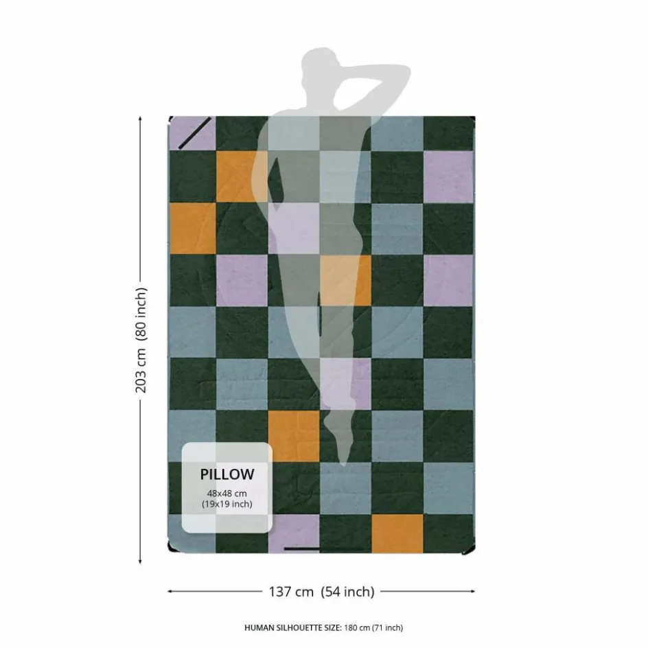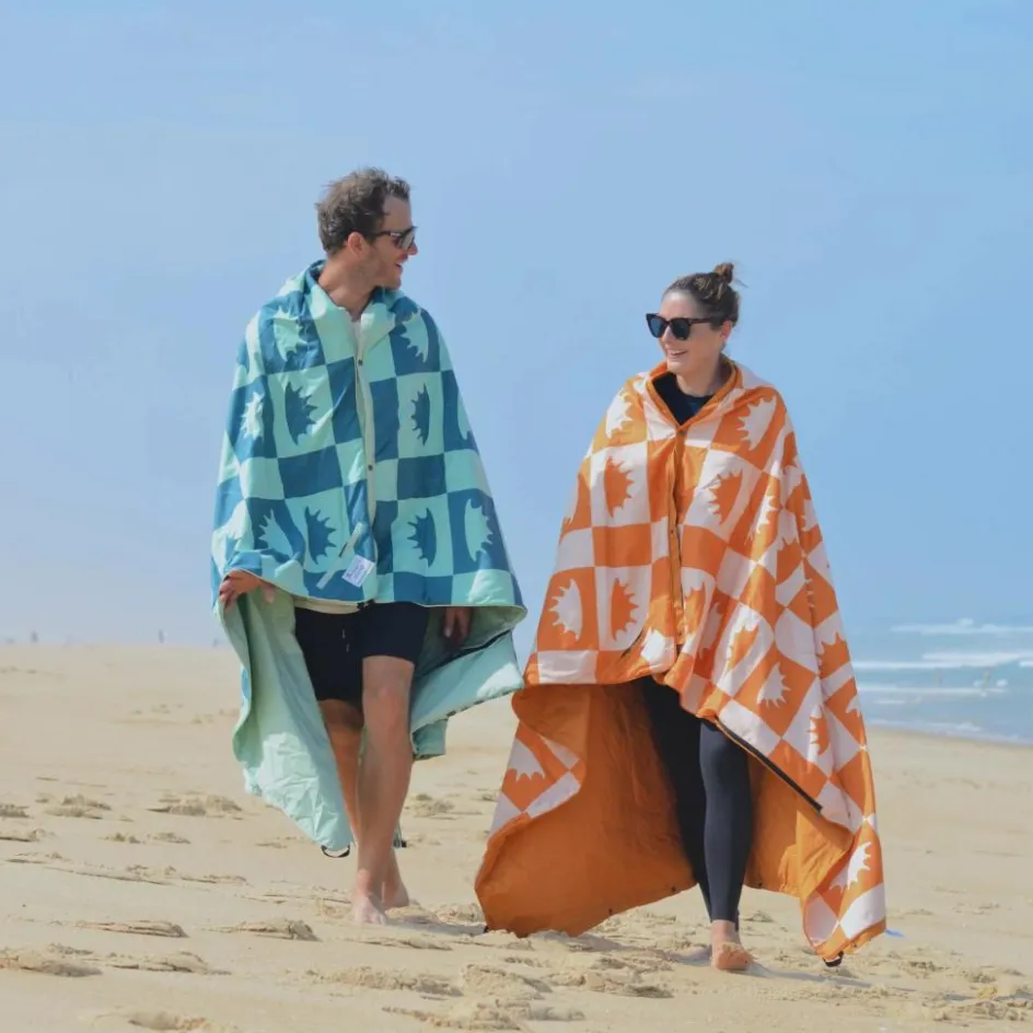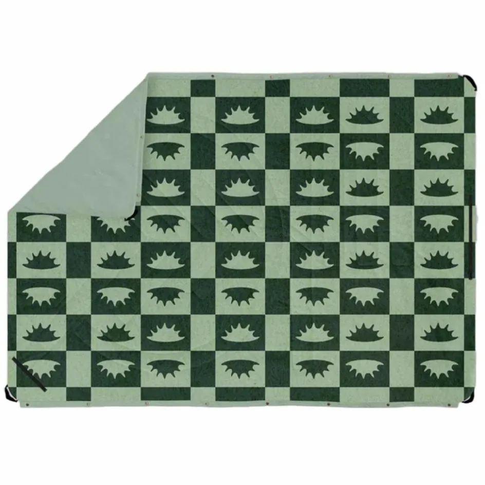Die Voited Picnic Blanket verfügt über seitliche Druckknöpfe, mit denen du mehrere Decken miteinander verbinden kannst. Alternativ lässt sich die Decke auch mit der gegenüberliegenden Seite zusammenknöpfen und überwerfen. So entsteht entweder ein Sichtschutz zum Umziehen oder ein regendichtes Cape, das dich trocken vom Strand nach Hause bringt.