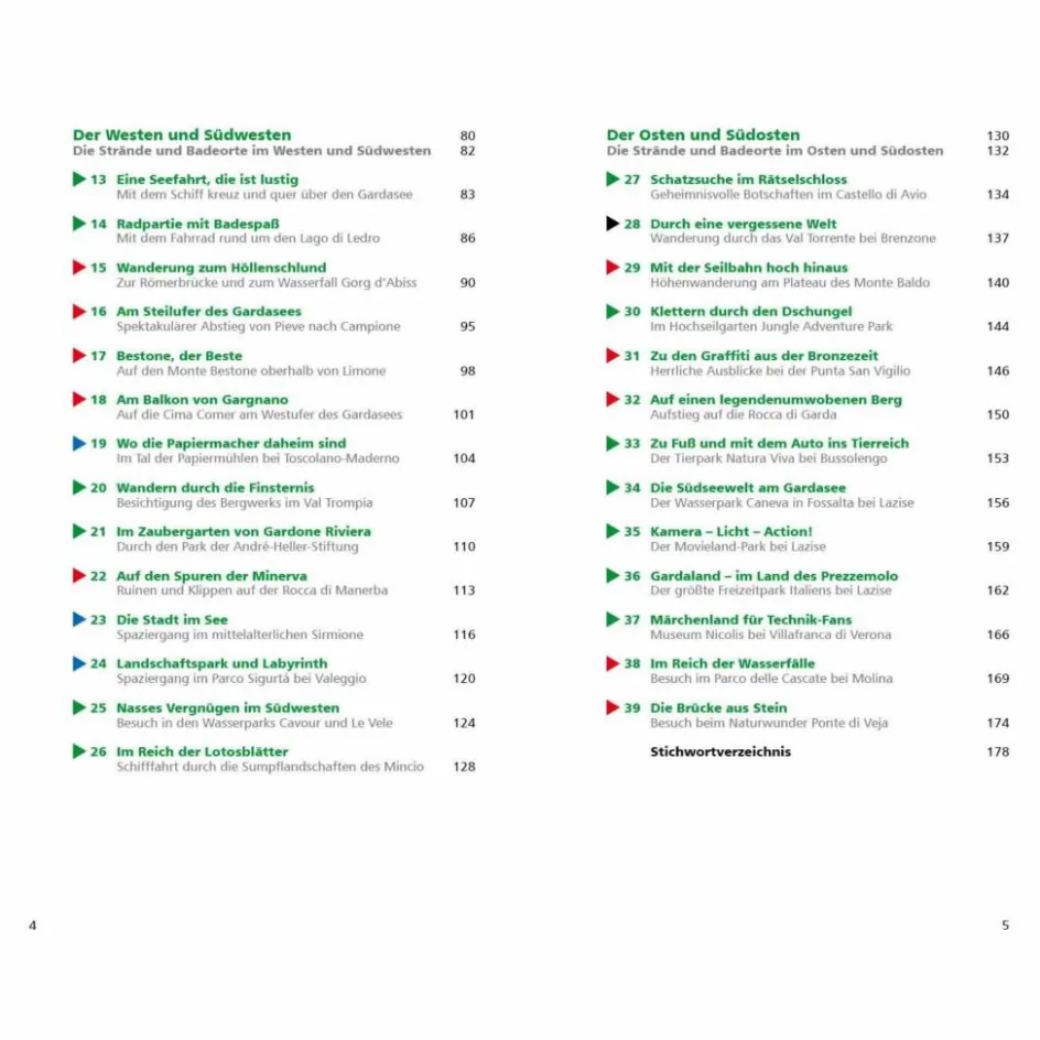 Bei allen Programmpunkten sind Altersempfehlungen, Angaben über den Zeitaufwand und gegebenenfalls anfallende Kosten angeführt. Die Wanderungen werden ausführlich beschrieben und durch detaillierte Karten und Höhenprofile ergänzt. GPS-Daten stehen zum Herunterladen zur Verfügung. Und »Rothi«, das kleine Murmeltier, berichtet ganz speziell den Kindern spannende, interessante und lustige Geschichten um und über den Gardasee.