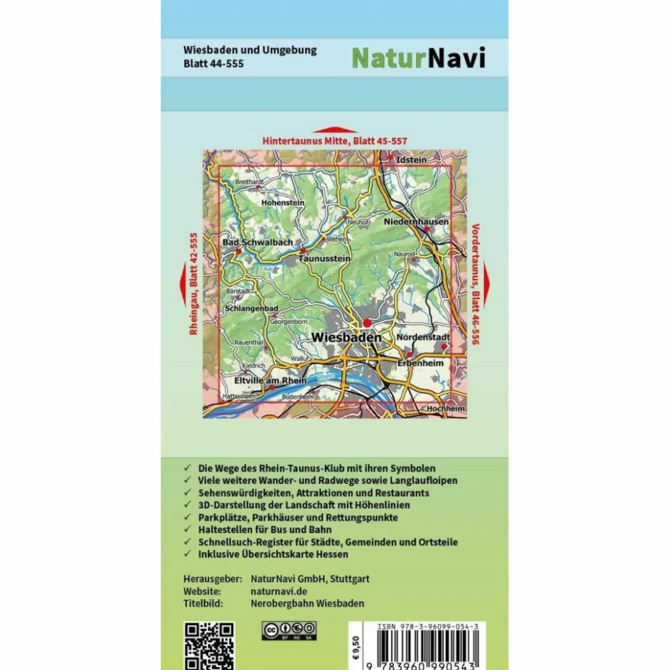 . Offizielle Karte des Rhein-Taunus-Klub e.V.. Die Wege des Rhein-Taunus-Klub mit ihren Symbolen. Viele weitere Wander- und Radwege sowie Langlaufloipen. Sehenswürdigkeiten, Attraktionen und Restaurants. 3D-Darstellung der Landschaft mit Höhenlinien . Parkplätze, Parkhäuser und forstliche Rettungspunkte. Haltestellen für Bus und Bahn. Schnellsuch-Register für Städte, Gemeinden und Ortsteile. Inklusive Übersichtskarte Hessen