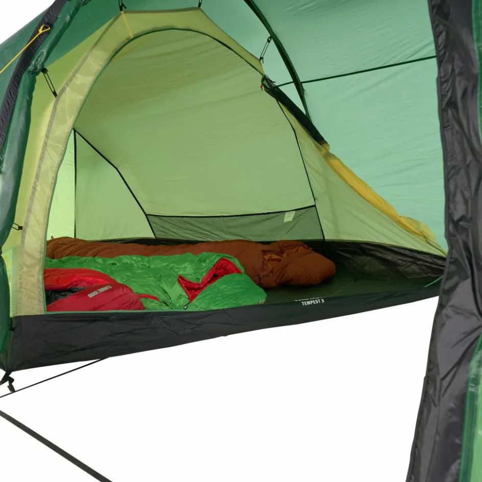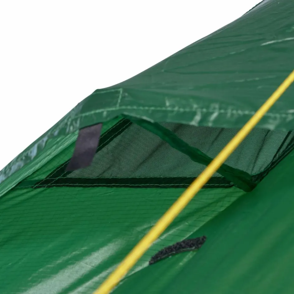 Trotz des asymmetrischen Schnitts, ist in der Apsis ordentlich Platz. Der Zutritt zum Zelt kann zu zwei Seiten erfolgen. Rucksäcke, Taschen und andere Ausrüstungsgegenstände finden ihren Platz im großzügigen Schnitt. Ist es eine besonders warme Nacht, kannst du die Apsis bis zum ersten Gestängebogen aufrollen und für maximale Belüftung sorgen. Vier seitliche Lüfter garantieren besten Luftaustausch bei schlechtem Wetter.