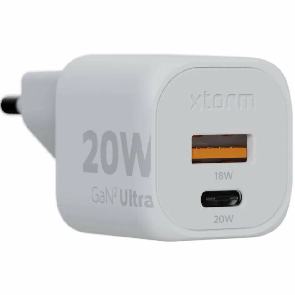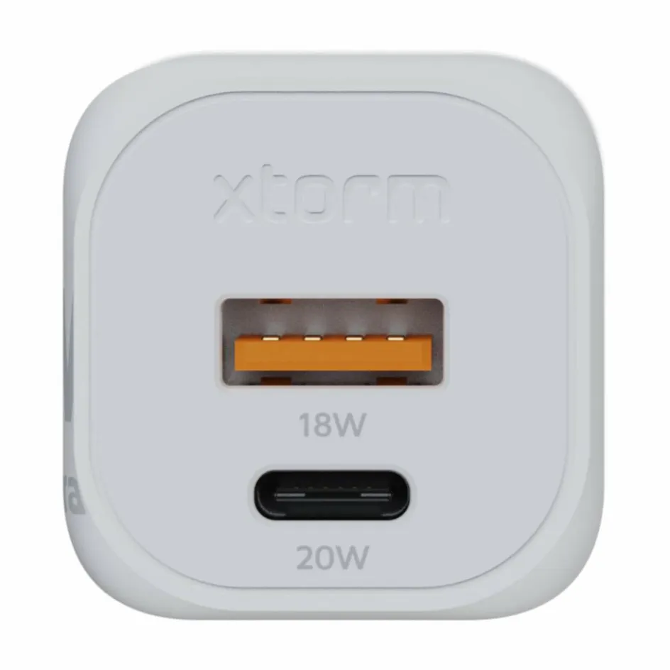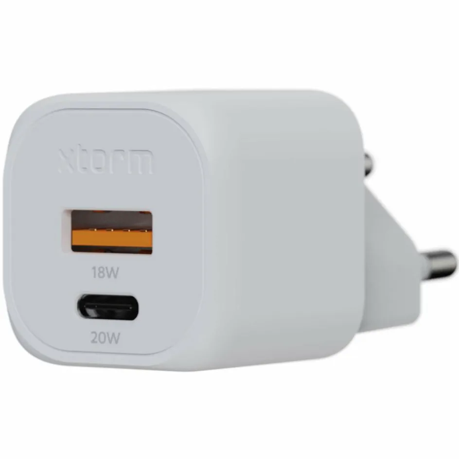 USB-Ladegerät mit äußerst kompakter Bauform und zwei Anschlüssen: einem USB-A QC (18 W) und einem USB-C QC Anschluss (20 W). Dank des kleinen Formats ideal für das Reisegepäck geeignet.
