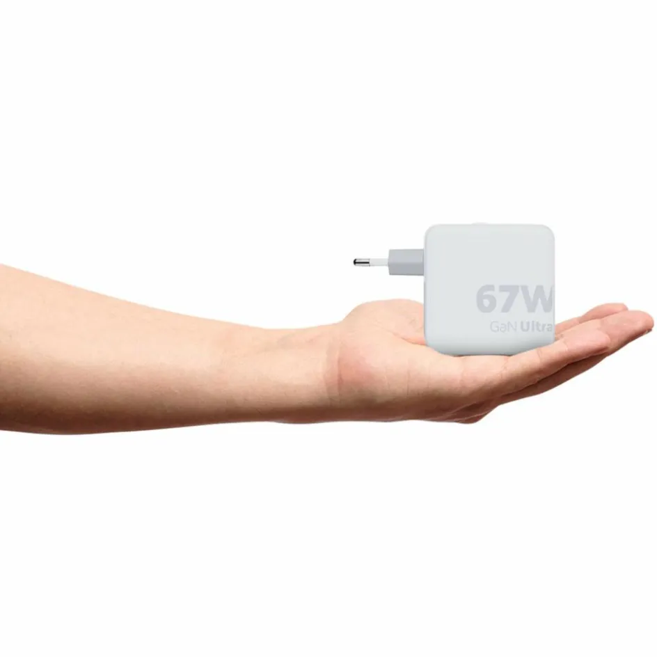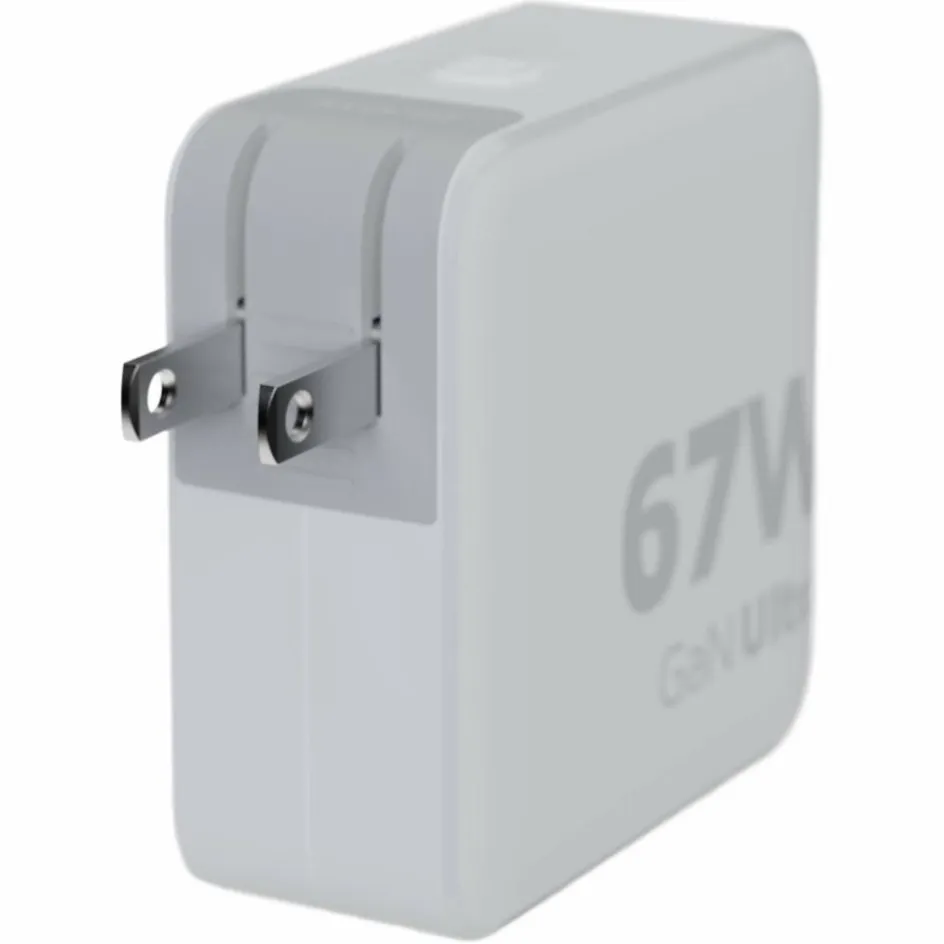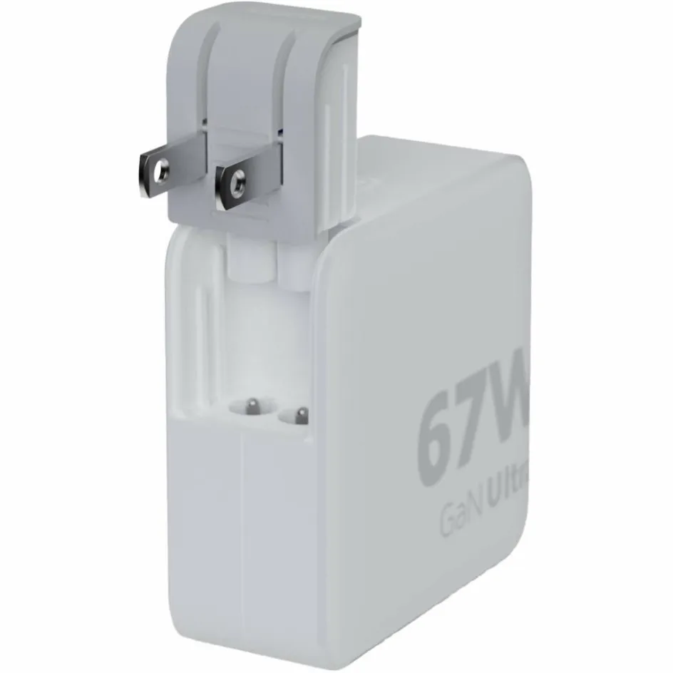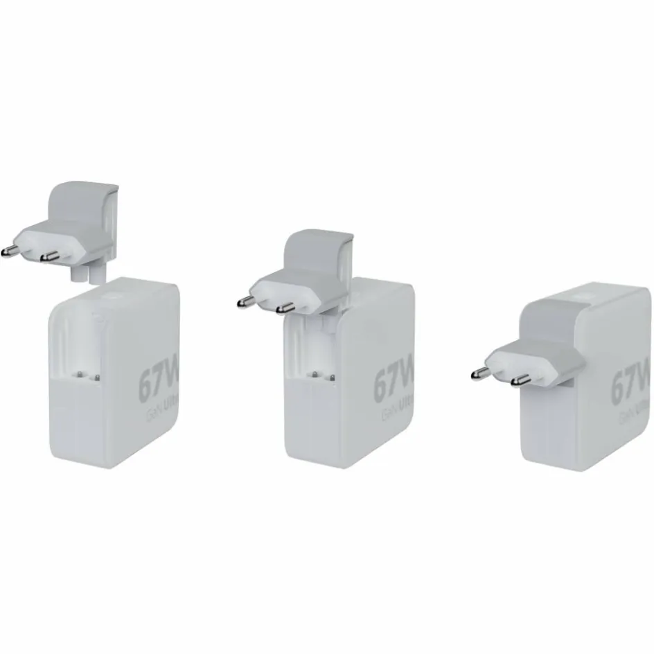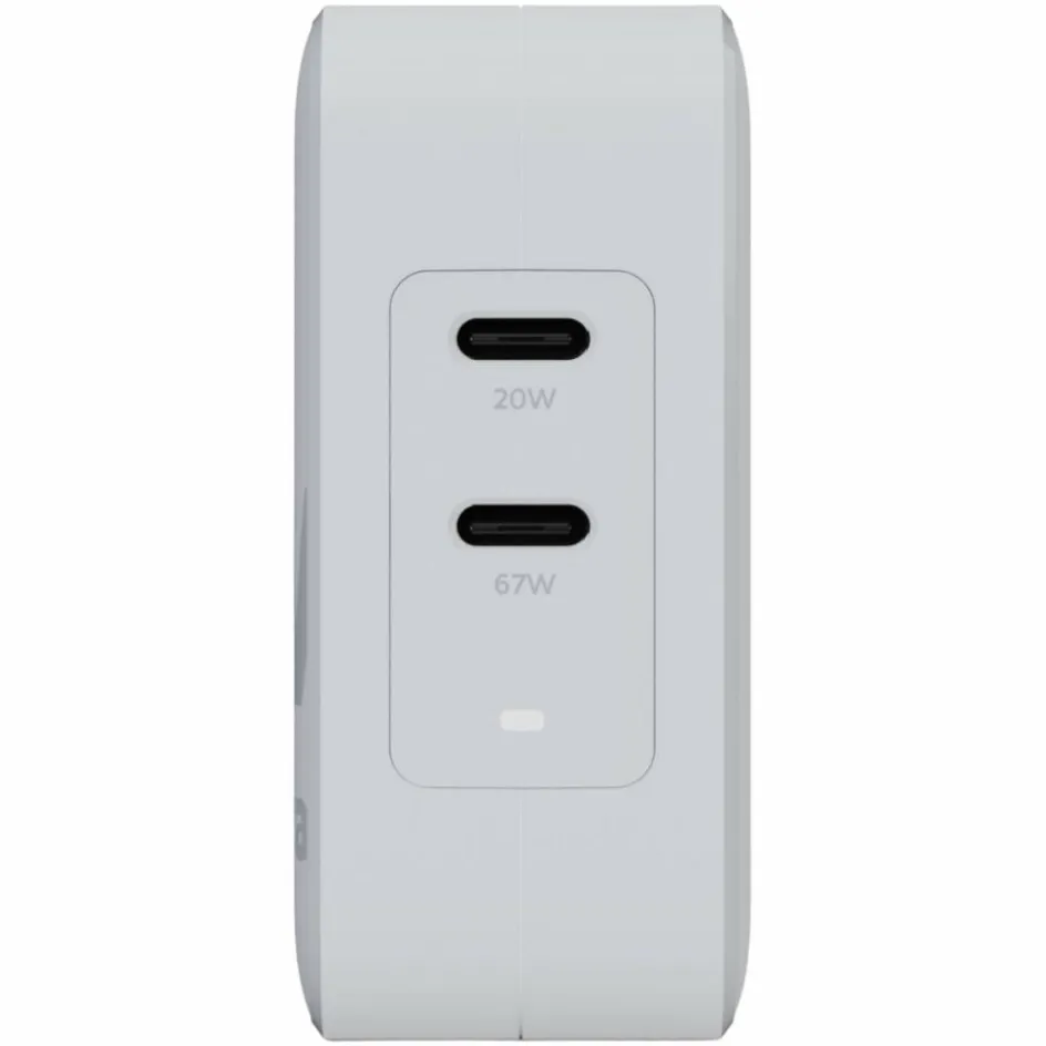 Der Adapter verfügt über zwei USB-C-Anschlüsse mit 20W und 67W. Dadurch kannst du unterwegs neben deinem Notebook gleichzeitig auch dein Smartphone oder Tablet aufladen. Der EU-Stecker kann werkzeugfrei gegen den beiliegenden US- oder UK-Stecker getauscht werden.