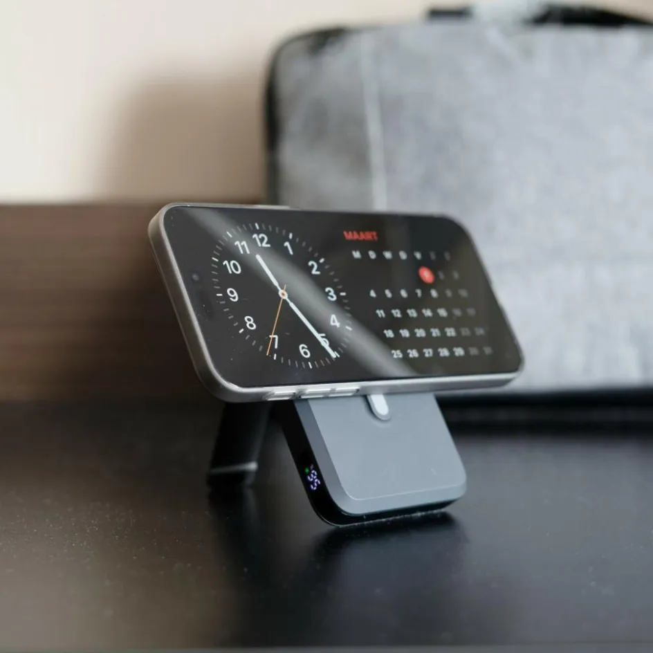 Powerbank mit 10.000 mAh Akkukapazität, Schnellladefunktion, USB-C-Anschluss und magnetischer Ladefunktion. Durch die Standfunktion eignet sie sich ideal für die Arbeit und auf Reisen.